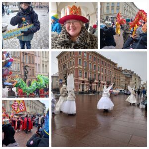 Kto przyszedł punktualnie na spotkanie mógł zobaczyć na pustawym wtedy Placu Zamkowym orszak aniołów na wrotkach przemykających pomiędzy płatkami śniegu lub ćwiczenia tańca chińskiego węża. W orszaku azjatyckim wiły się węże czerwony i zielony. Miło było patrzeć na gęsty tłum oglądający orszak ubrany w rozdawane przez nas korony, a potem śpiewający kolędy ze śpiewników, które rozdawaliśmy.